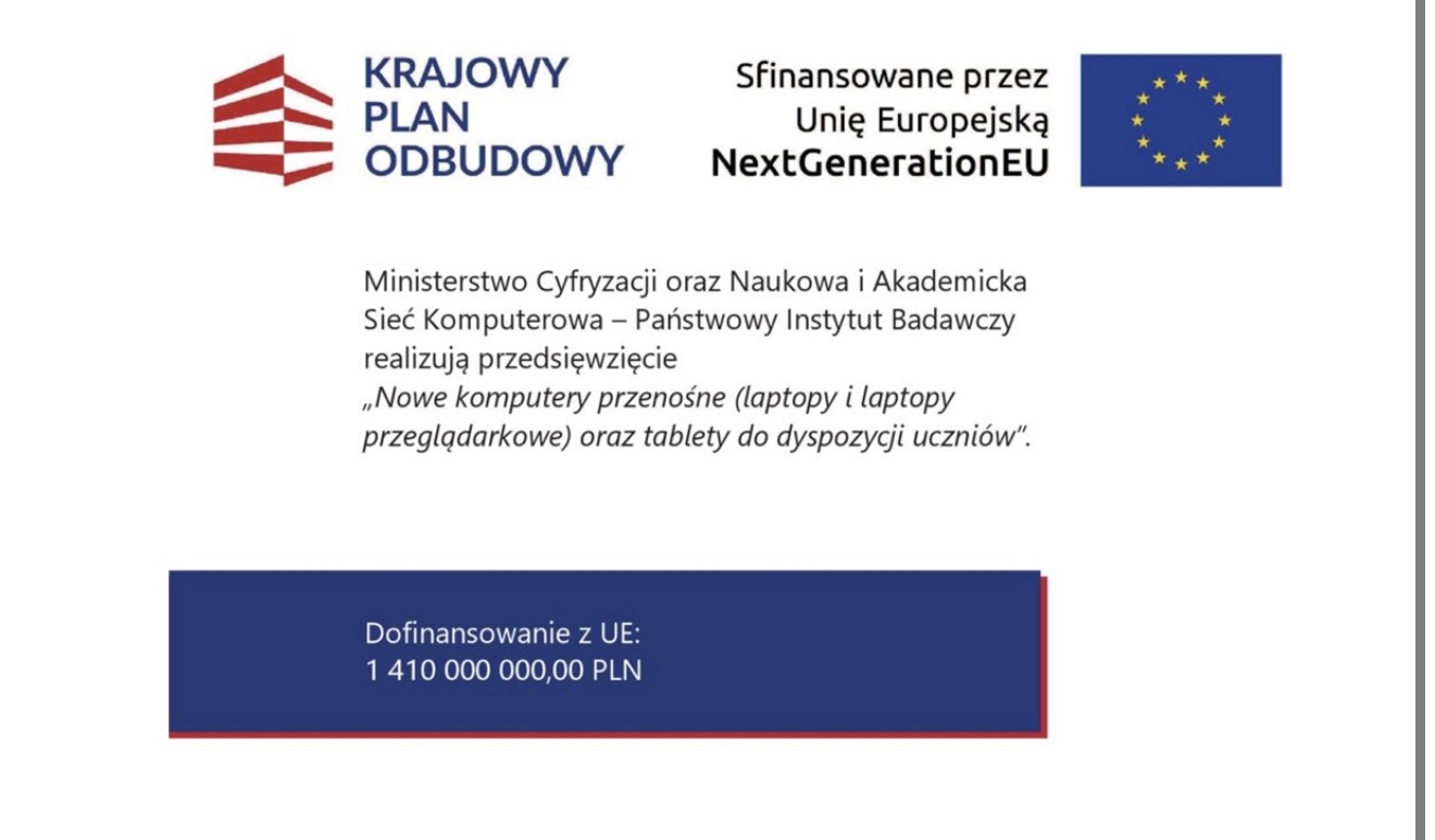 „Wdrażanie inwestycji C2.1.2 Wyrównywanie poziomu wyposażenia szkół w przenośne urządzenia multimedialne – inwestycje związane ze spełnieniem minimalnych standardów sprzętowych, wskaźnik C15G – nowe komputery przenośne (laptopy, laptopy przeglądarkowe i tablety) do dyspozycji uczniów”,
